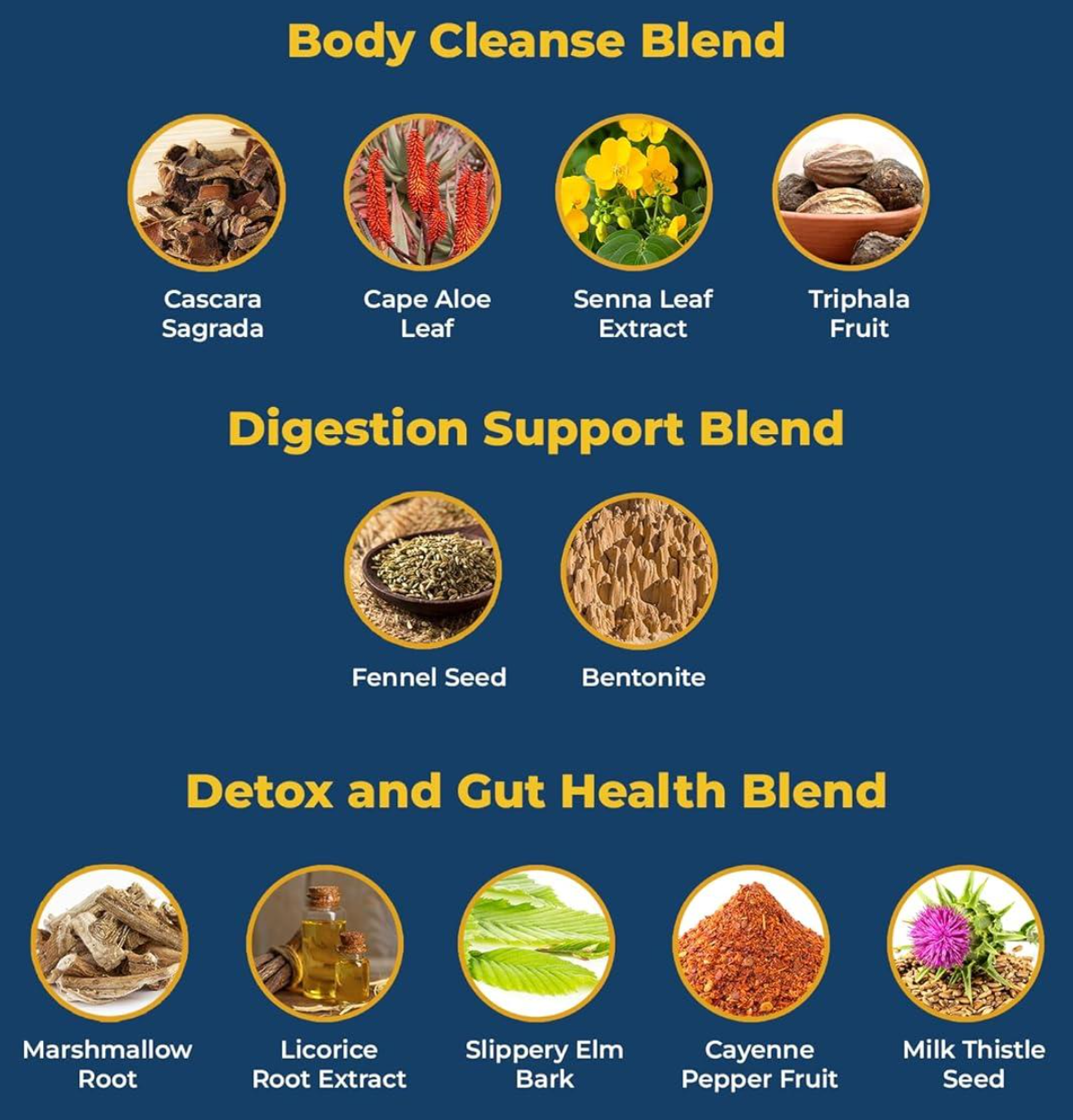 BellyFlush also frequently includes mild herbal stimulants or motility-supporting herbs that encourage bowel contractions and ease transit. Herbs such as senna or cascara (in small, controlled amounts) act on intestinal receptors to gently increase motility, while carminative herbs reduce gas formation. The combination aims to shift a sluggish gut toward more predictable rhythm without aggressive or painful cramping. This makes the product useful as a short-term corrective tool.